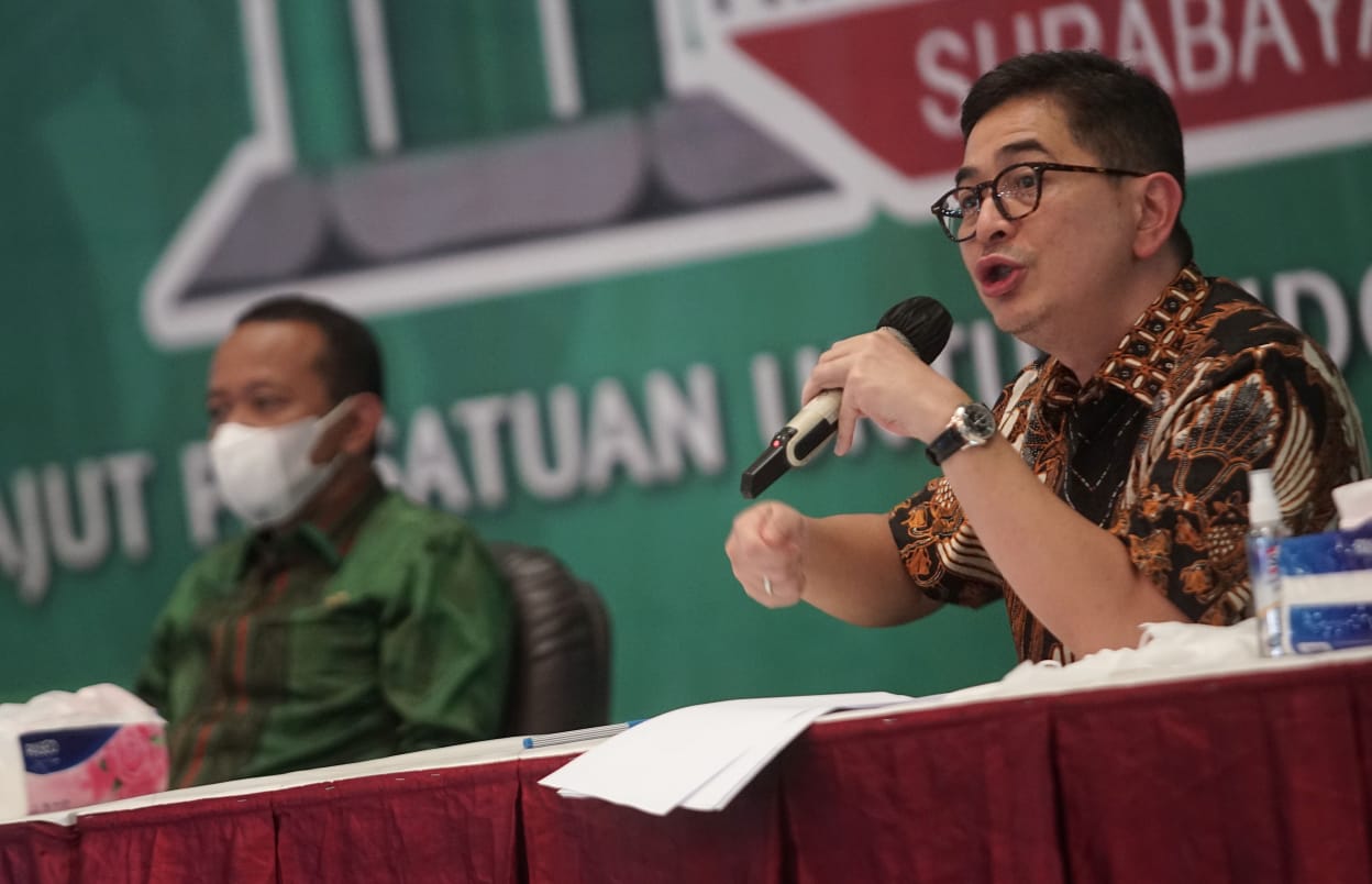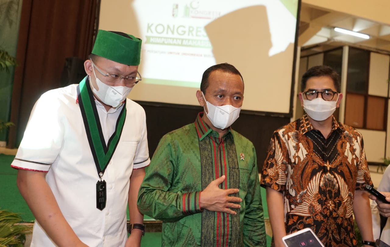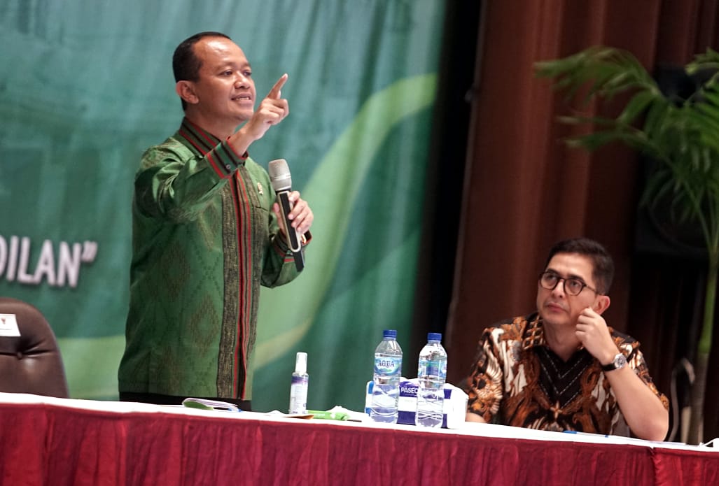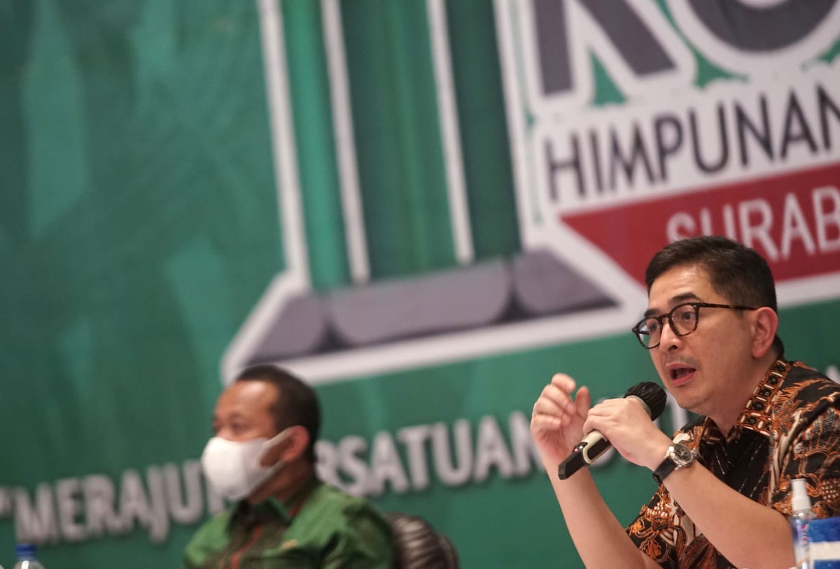 Kepala Badan Koordinasi Penanaman Modal (BKPM) Bahlil Lahadalia (kiri) bersama Presiden Direktur Indika Energy Tbk Arsjad Rasjid (kanan) memberikan materi ketika menjadi pembicara pada seminar bertema “Investasi Dalam Roadmap Kebangkitan dan Kedaulatan Ekonomi Nasional Pasca Pandemi COVID-19” di Surabaya, Jawa Timur, Kamis (18/3/2020). Dalam seminar yang digelar pada acara Kongres XXXI Himpunan Mahasiswa Islam (HMI) tersebut Arsjad Rasjid dan Bahlil Lahadalia mengajak para kader HMI menjadi pengusaha untuk membantu pemerintah menciptakan lapangan kerja.